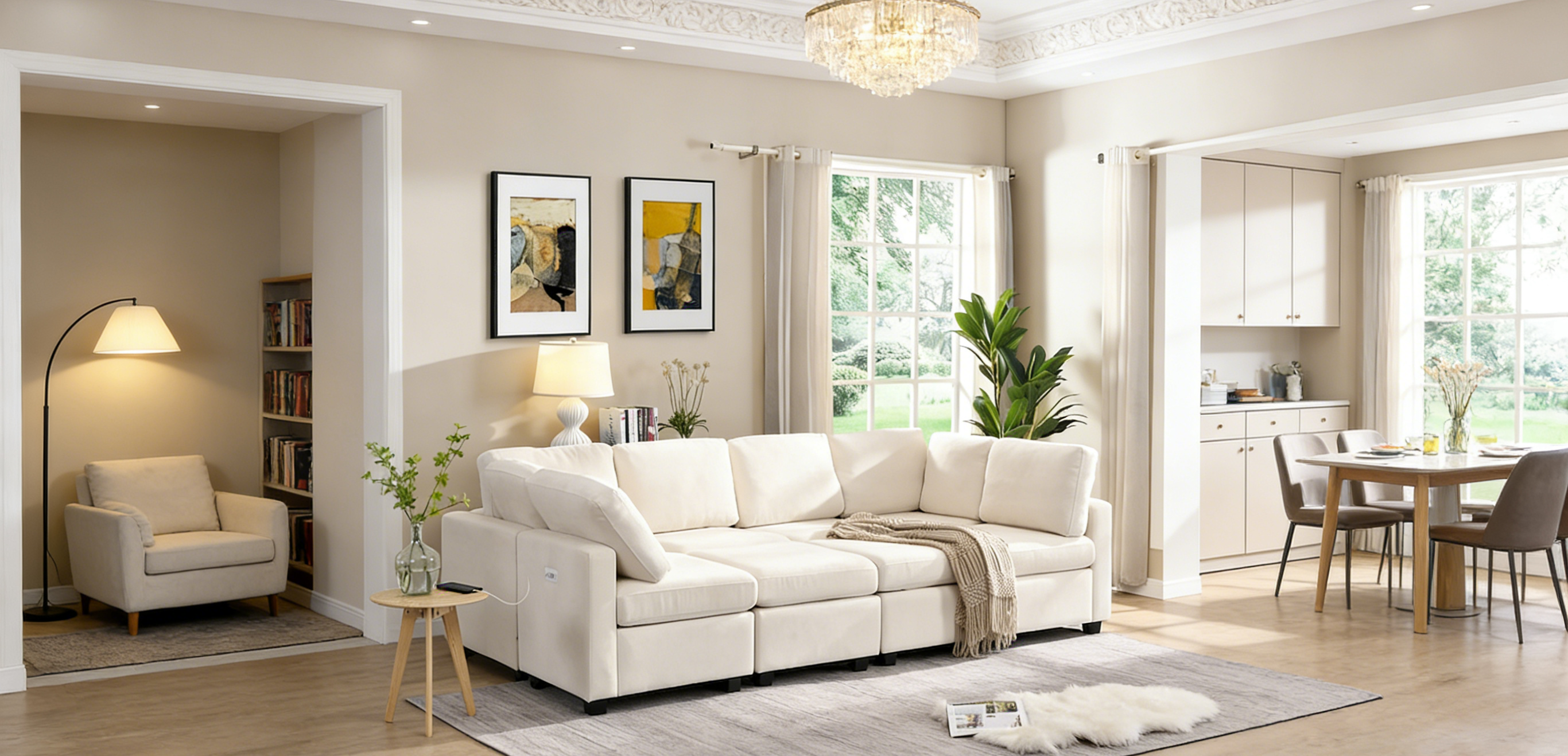 This versatile and stylish five-seat sectional sofa will elevate your living space. Combining practicality, comfort, and modern aesthetics, it boasts ample storage space, a removable ottoman, and comfortable chenille fabric.